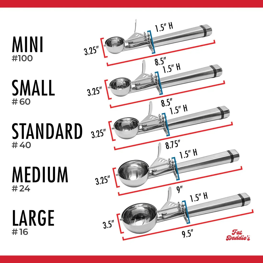 #40 Standard Scoop Size: 1 2/3 tbsp (25 ml), makes 3" (7.6 cm) cookie. Experience precision, ease and quality with Fat Daddio's ProSeries Scoops, the ultimate tools for both home bakers and professional chefs. The premium, smooth release mechanism ensures a clean release of consistent recipe measurements, making them indispensable for cooking and baking. Whether portioning batter for cupcakes and muffin, scooping perfectly sized meatballs or balling fruit, these durable scoops can handle it all.