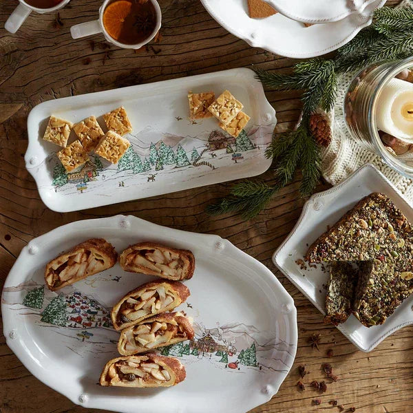 The mythical, folkloric world of the North Pole is hand illustrated atop iconic Berry & Thread shapes in this new holiday collection. Find the elves’ village and toy workshop depicted on this generously sized 17” platter with subtly scalloped rim.