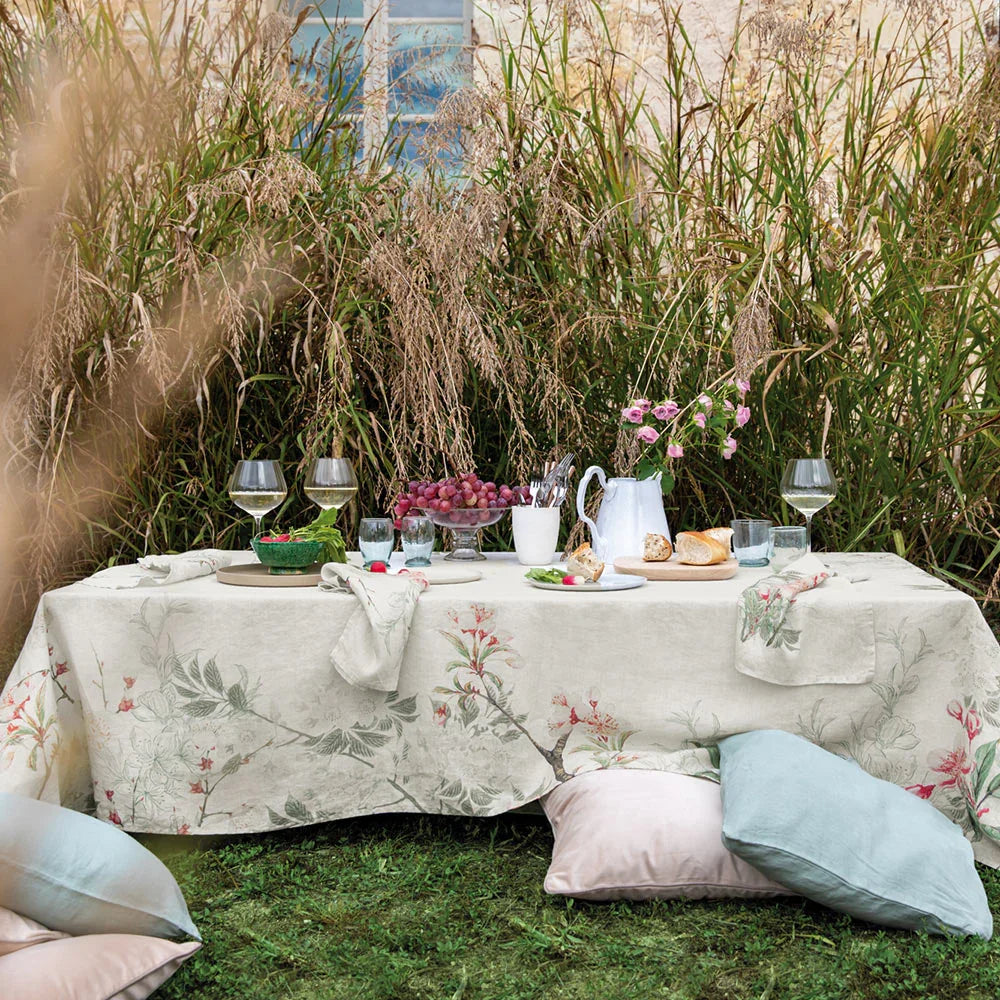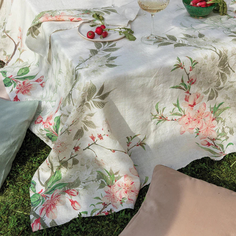 French tablecloth with lively pink and green colors. Cherry blossoms are known in Japan as the emblem of love, and in France, especially at the Parc du Domaine des Sceaux they are the reason for a classic springtime outing. People gather at the park to celebrate, harami, or flower viewing. This exquisite linen representation of the most powerful emotion in the world is an excuse to leave it on all year long starting on Valentine's day.