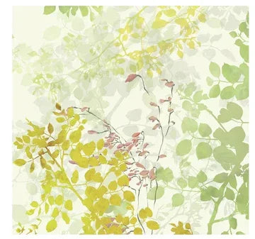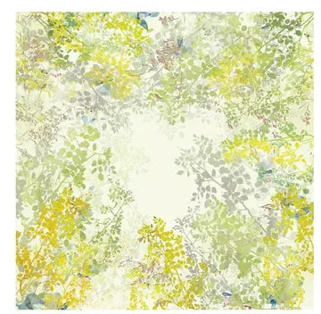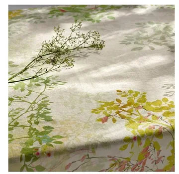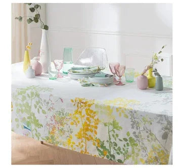 Like a watercolor of Spring, this French tablecloth with brushes of green, gray, yellow, blue, and pink colors has drawn-out branches bursting with unspoiled new leaves. Hints of blue and pink throughout serve as birds nibbling on some fresh berries on trees.