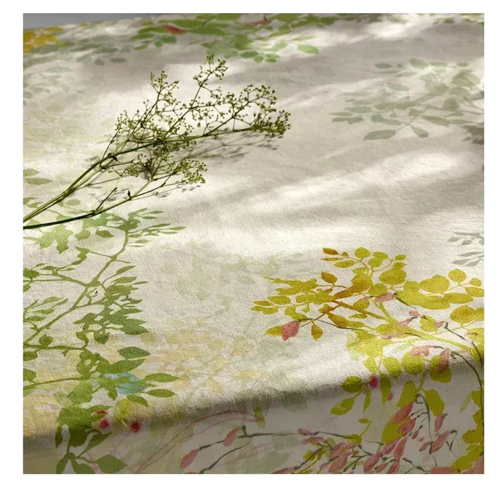 Like a watercolor of Spring, this French cotton / linen table runner with brushes of green, gray, yellow, blue, and pink colors has drawn-out branches bursting with unspoiled new leaves. Hints of blue and pink throughout serve as birds nibbling on some fresh berries on trees.