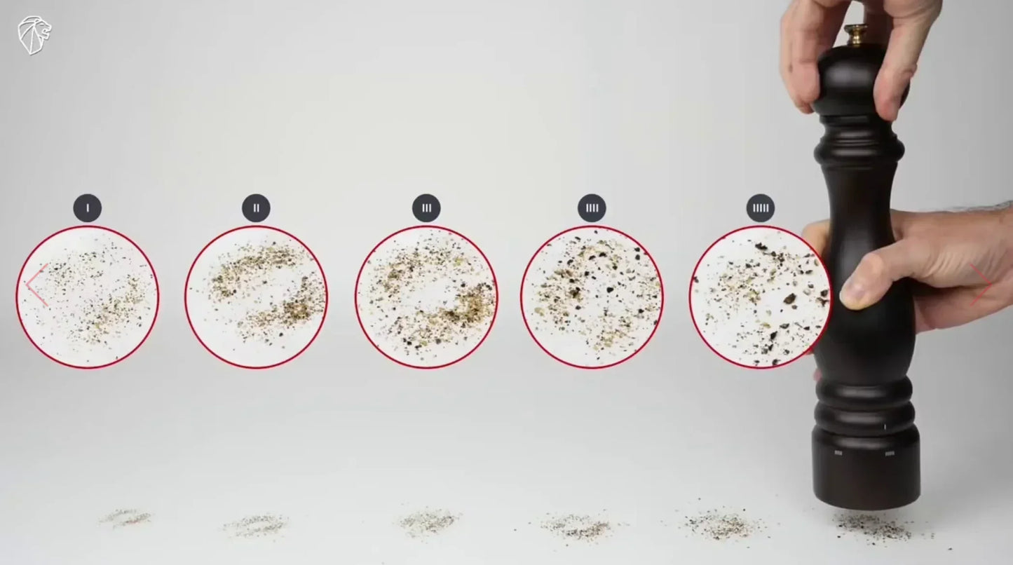 The curves of the Peugeot Paris u’Select salt mill pair perfectly with the warmth of the wood. The gourmet look is enhanced by a rich and elegant chocolate finish. Created by Peugeot in 1987, the Paris mill is the archetypal grinder, the first choice of the chefs in the world, and a symbol of refined and authentic cooking. This salt mill features the Peugeot u’Select custom grind control system built in the base of the mill to allow users to accurately select their preferred grind size. Six grind presets are available: 1 for the finest grind and 6 for a medium to coarser grind.