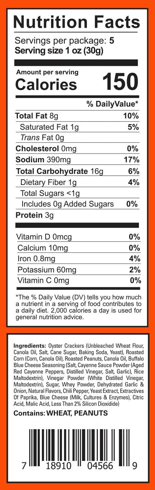 If you're like us, the most exciting part of game day is the wings. Unfortunately, those saucy masterpieces can be a big sloppy mess, so we tossed tangy buffalo flavor and blue cheese onto our crispy crunchy blend of oyster crackers, giant corn, and Carolina peanuts. Score!