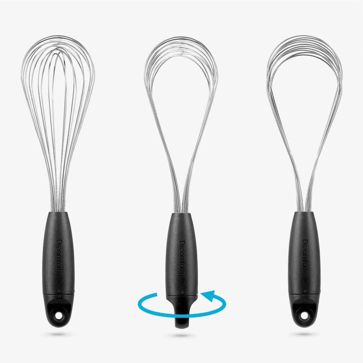 Flisk is a balloon whisk that twists into a sauce whisk or completely flat for deglazing. Flisk is a balloon whisk that twists to create three whisks from one. A half turn of Flisk’s ergonomic handle twists the 10 large, high-vibration wires into 3 distinct forms – a large balloon whisk for whipping, a sauce whisk for shallow liquids and gravy, and a flat whisk for deglazing. Best of all, Flisk’s wires completely flatten for space-saving storage and easy cleaning in the dishwasher. Go on, it’s time to whisk it for the biscuit.
