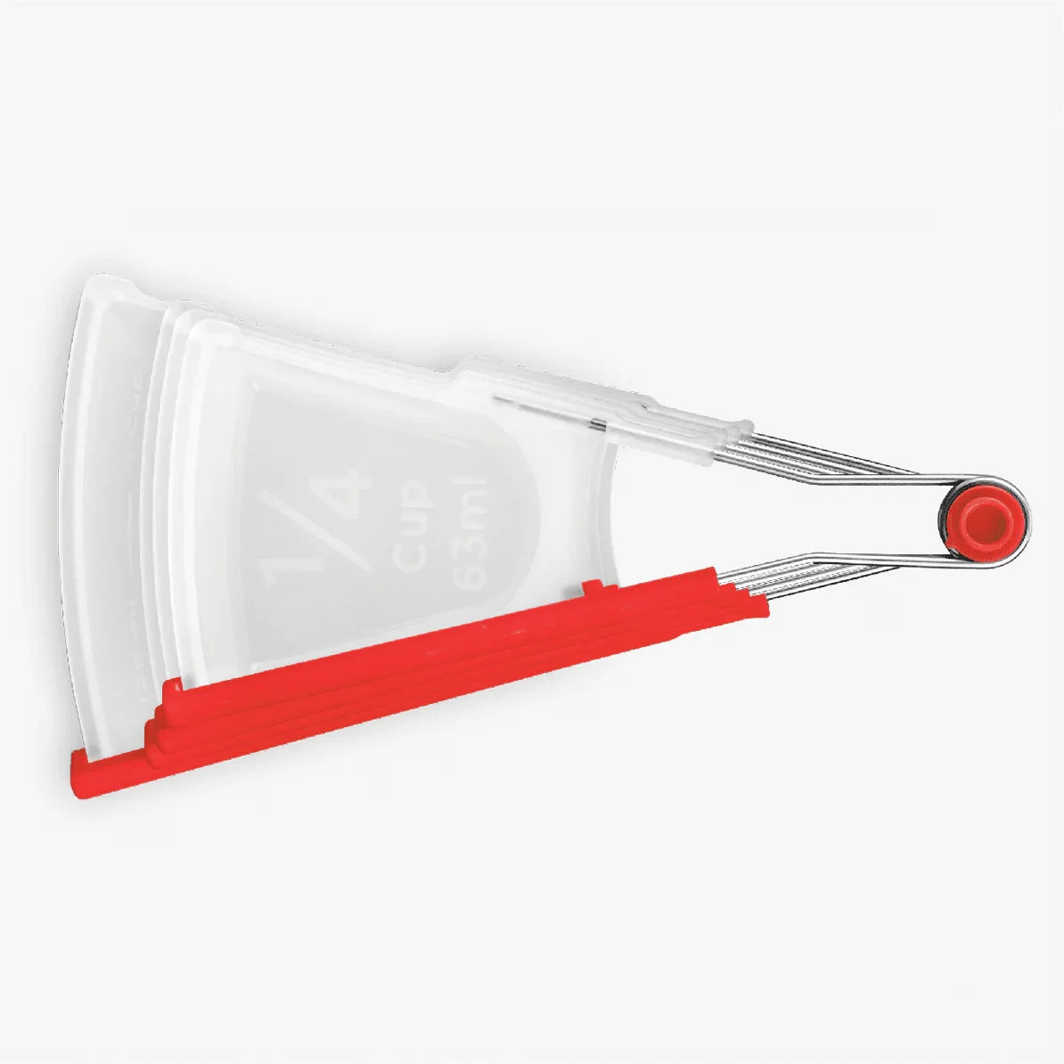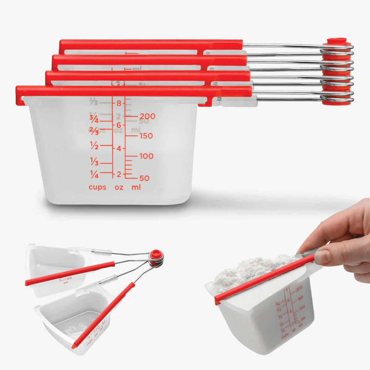 Levups are our incredible levelling measuring cups that are perfect for both dry and liquid ingredients. Each Levup is clearly marked with cup, ounce and millilitre measuring lines for liquids. For dry ingredients, Levups handles squeeze together to make a scraper swipe across and push off any excess, leaving you with a perfectly level and accurate measurement. Levups are a set of 4 measuring cups that snap together for storage and can be easily snapped apart so you only have to wash the dirty ones.