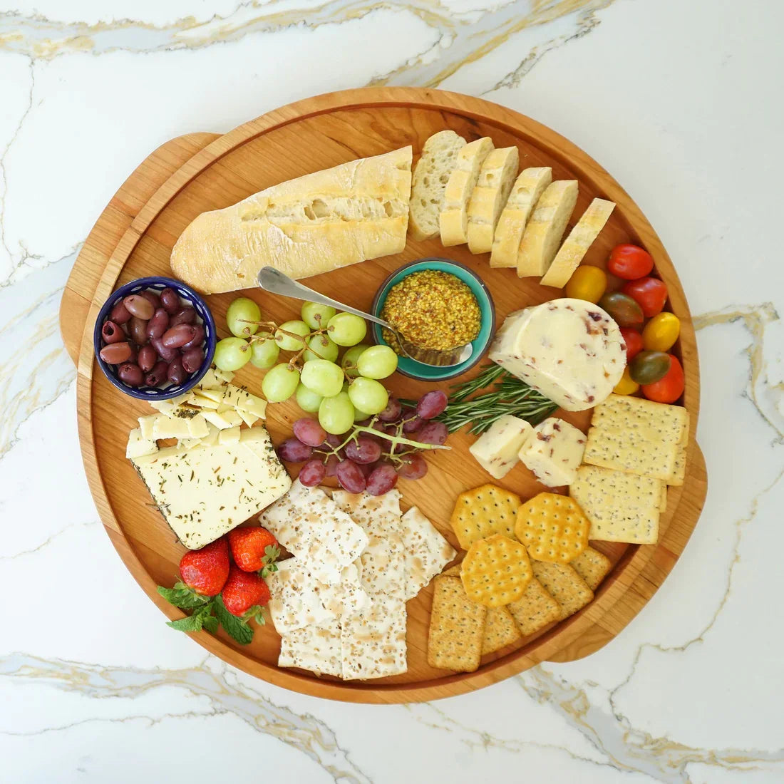 This 18" round wooden serving tray is made from high-quality cherry wood, providing a durable and elegant option for serving meals and drinks. The round shape allows for easy passing and sharing, making it perfect for entertaining guests or for everyday use. Elevate your dining experience with this versatile and stylish tray.