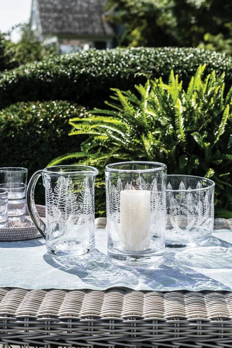 Inspired by etched glass pieces from Simon’s Georgian glass collection, our botanical fern motif is a classic symbol of the arrival of spring. Show off the texture of this simple cylindrical shape by illuminating from within with a pillar candle; or put it on display as a nature-inspired vase.