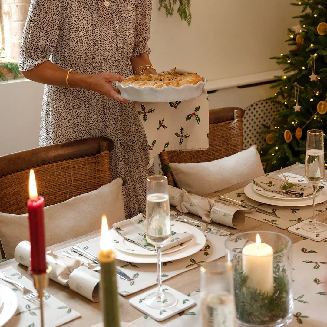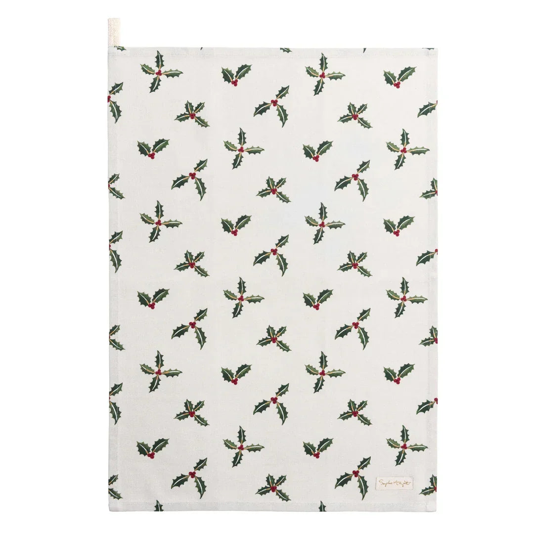 A lovely set of 2 tea towels that are perfect for adding some Christmas spirit to your kitchen. The first tea towel features our scene design: Welcome Christmas into your kitchen with this gorgeous 'Home for Christmas' scene tea towel. Silver footsteps through the snow lead up to the door of a family home – decorated with a wreath and accompanied by glowing lanterns, presents, and snowshoes. Whilst the second tea towel is covered in sprigs of green holly with bright red berries on a neutral stone ground, this Christmasy tea towel has subtle gold details and will bring both festive spirit and style to your kitchen. There is a handy 'loop' in the top left corner of each tea towel, so you can hang them up in your kitchen.