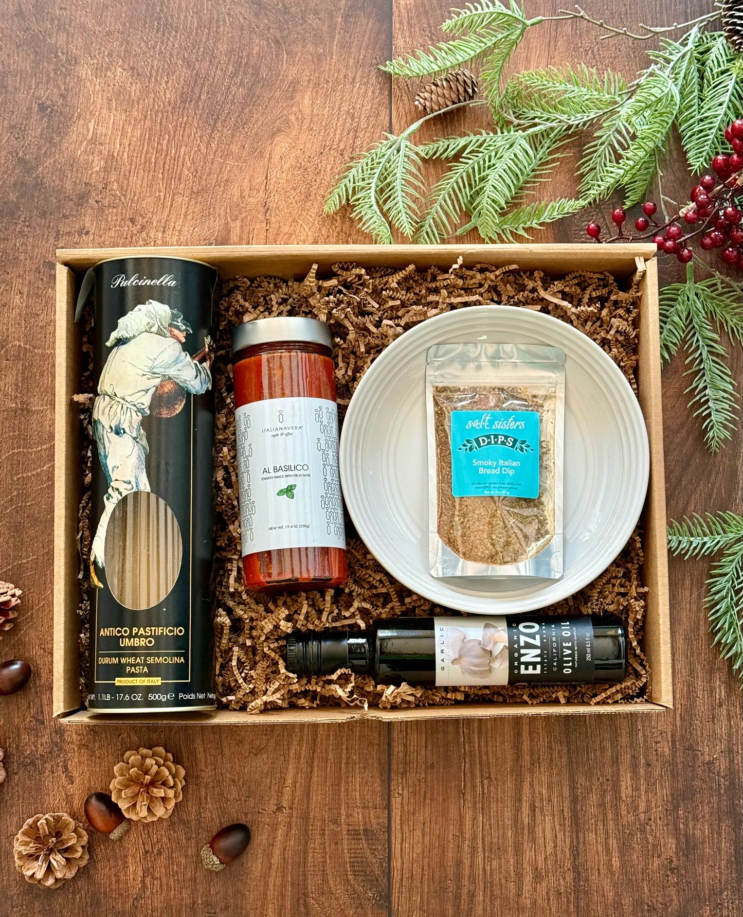 Our Italian Dinner Gift Set brings an authentic taste of Italy to your friends and family. Everything you need to make a beautiful and delicious Italian meal at home. Includes: Pulcinella Spaghetti, Al Basilico Sauce, Smoky Italian Bread Dip, Garlic Olive Oil and Vancouver Pasta Bowl