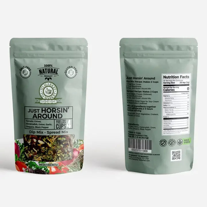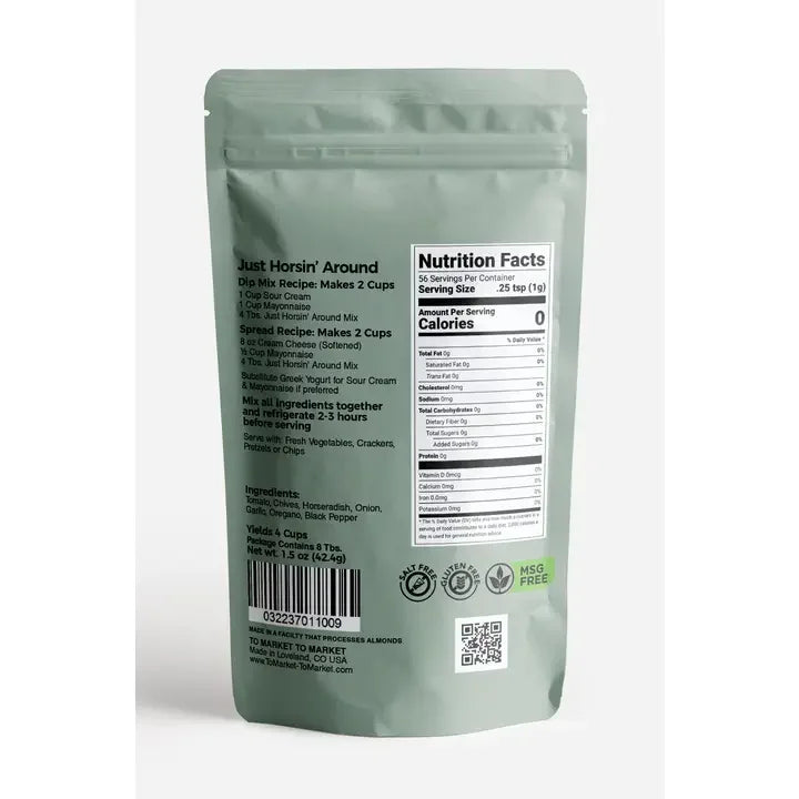 INGREDIENTS: Tomato, Chives, Onion, Garlic, Black Pepper, Oregano and Horseradish No MSG, No Chemicals, No Preservatives, No Salt, Gluten-Free EACH PACKAGE: Yields 4 Cups of Dip