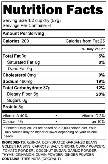 A mix of savory and sweet in one dish that's delicately seasoned with curry, golden raisins, and garbanzo beans. Add your favorite protein to make this a complete one pan meal, or simply enjoy on its own. This is a very versatile dish perfect for everything from entertaining to a family picnic. (Serves 4-6)