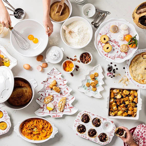 On a gleaming and snowy whitewash background and trimmed with a sprinkling of our iconic berries, this petite tree platter is decorated with our magical winter wonderland scene from the North Pole. Perfect for presenting appetizers and sides, and positively irresistible with homemade sugar cookies!