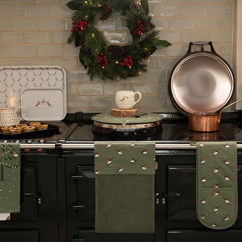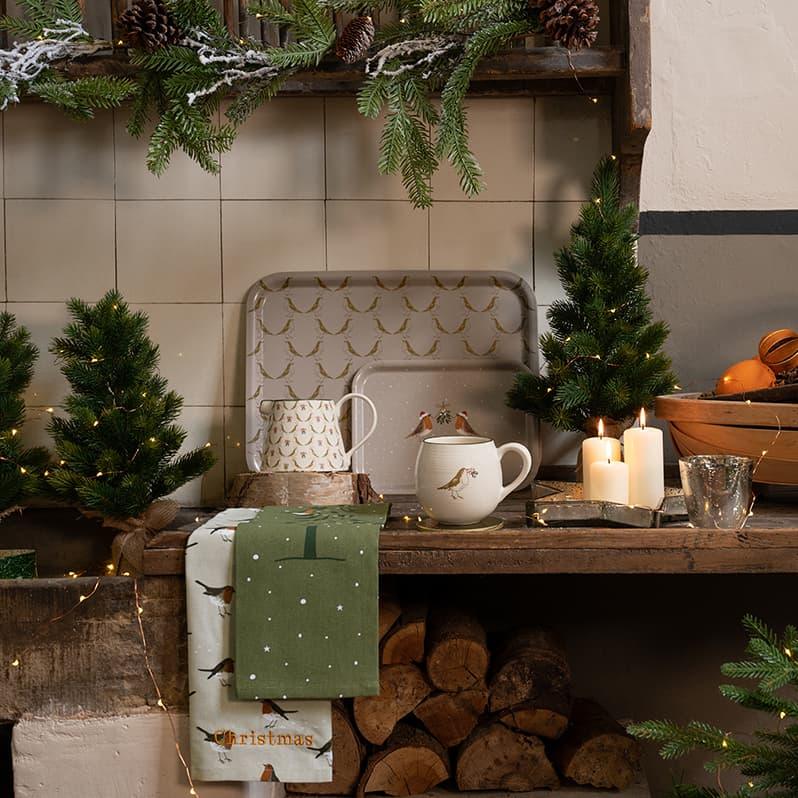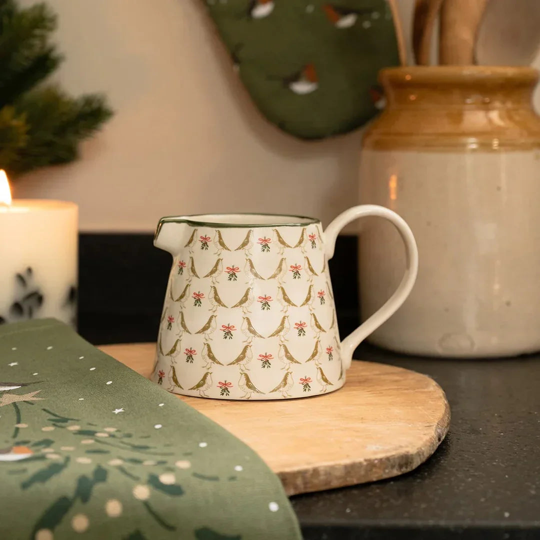 A festive stoneware jug from our classic and timeless Robin design. This large jug is dotted with Robins and mistletoe with an olive green contrasting rim, perfect for homemade gravy on the big day!
