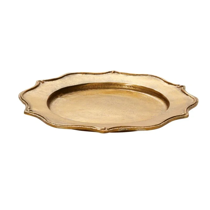 Bring the warmth of the holidays to the table with the elevated look of the recycled cast aluminum Serendipity Charger. With an antique gold finish, inset center, & scrolled exterior outline, this table setting is beautiful layered beneath dinnerware, colorful holiday dinnerware, or simple event plates to offer an understated elegance.