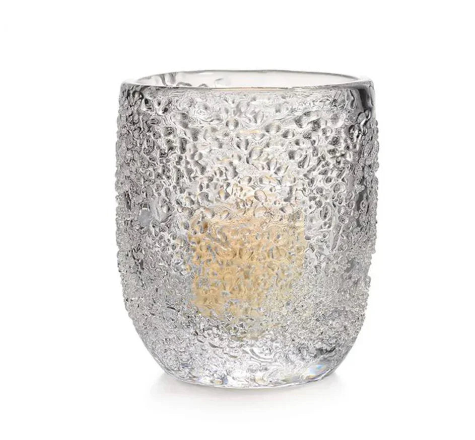 Nestled between Green Mountain peaks, Sterling Pond is Vermont’s highest-elevation alpine pond – and one of the state’s most breathtaking settings. The jewel-like dewdrops that freeze around its perimeter inspire the icy effect, applied here in glass. This hurricane beautifully showcases its unique texture when lit from within.