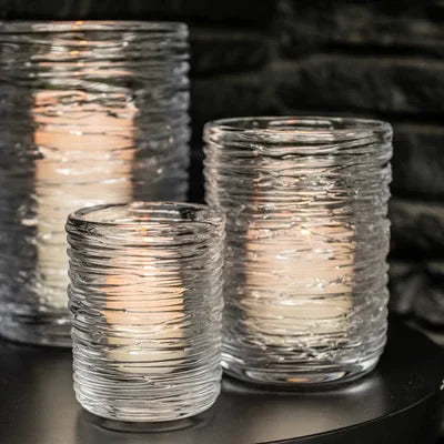 Vendor:SIMON PEARCERegular price $170.00Regular priceUnit price / perSale price $170.00Frozen in winter, flowing in summer – our Echo Lake Collection is inspired by the constantly changing rivers, streams and waterways of Vermont. In a bold interpretation of the craft, master glassblowers nimbly wrap fine strands of glass around a round base to form the unique, natural silhouette of each tealight candle holder. All the more stunning when arranged in a glowing cluster. Sold as a set of two.