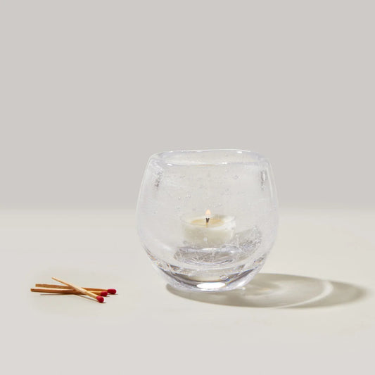 Regular price $100.00Regular priceUnit price perSale price $100.00Alive with the nuance of handmade glass, the Vela Tealight captures the quiet beauty of a winter night. Fine bubbles glimmer throughout its rounded silhouette, like stars frozen in ice.