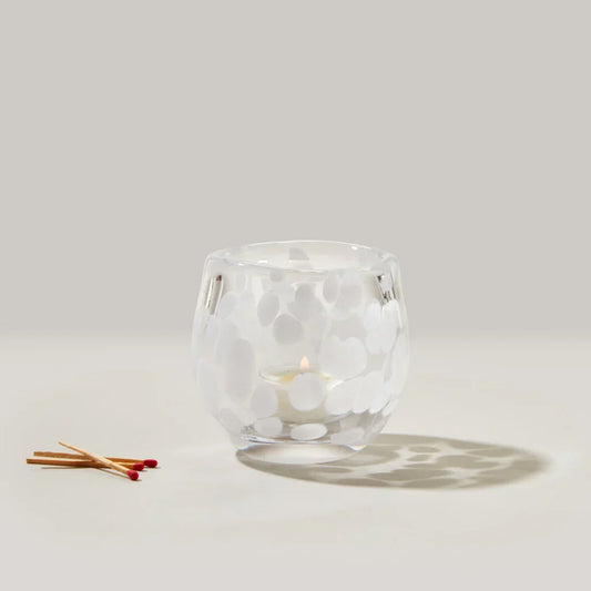 Regular price $100.00Regular priceUnit price perSale price $100.00Like snowflakes gathering on a winter’s night, white speckles dance across the surface of this glass tealight. Each one is handmade and entirely unique—casting a soft, snow-globe glow.