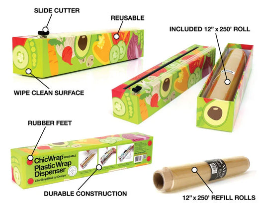 Our fun Veggie design puts the garden in your kitchen using nature’s color palette of ruby red to bright orange and everything in between.DETAILS: Each dispenser comes with one 12 " x 250 Ft. roll of BPA free professional grade plastic wrap, four rubber feet for stability on any counter and our patented ZipSafe® Slide Cutter. Our professional grade plastic wrap is FDA approved, Kosher certified, Halal certified and microwave safe. -
