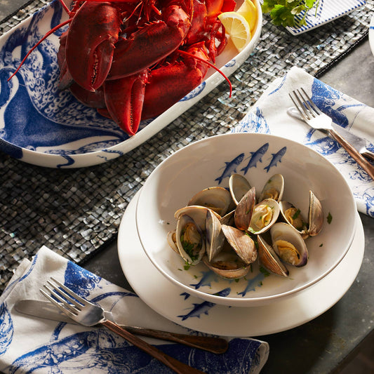Regular price $42.00Regular priceUnit price perSale price $42.00Schools of brilliant blue, delicately detailed fish swim playfully across the surface of these generous soup or pasta bowls. The creamy white premium porcelain makes these durable enough for everyday meals and decorative enough for guests. * Dimensions: 9" D * Microwave and dishwasher safe -