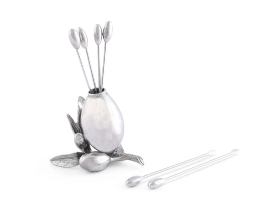 Regular price $50.00Regular priceUnit price perSale price $50.00Bring a bit of Mediterranean art and joie de vivre to your cheese service with our Olive Cheese Pick Set. Hand-cast in luxury pewter as a miniature still life of a fruit laden Olive twig, the holder has six picks, each topped with a tiny pewter olive. Size: 1"W x 1.5"L x 4"T Care: Hand wash only and wipe dry with soft cloth -
