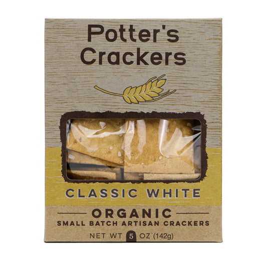 Regular price $7.49Regular priceUnit price perSale price $7.49Potter's Crackers are organic crackers designed with the best cheese and charcuterie in mind. When creating our best selling Classic White Organic Crackers we determined that sometimes the cracker has to be the bridesmaid and not the bride! If you would like a flavorful homemade organic cracker that won’t distract from what you serve it with, our Classic White cracker is for you. Not that they aren’t tasty to munch on all by themselves; they are crispy, salty, buttery, yum! Yes, our organic Classic White Crackers are made with real organic butter. No hydrogenated oils or GMO ingredients are ever used in our processes. Top with any sweet or savory spread and this versatile cracker will surely be up to the task. This cracker is truly the formidable choice for formidable cheese and charcuterie and is up to the task of delivering a wide range of flavors as a pairing option.