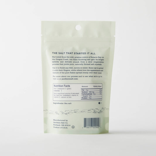 Regular price $15.00Regular priceUnit price perSale price $15.00Our signature flake finishing salt is the product that put us on the map. Hand-harvested from the cold and pristine waters of netarts bay on the Oregon Coast, our flaky finishing salt has bright salinity and a delicate crunch. Use it to finish savory and sweet dishes alike. Add to sliced steaks and roasts, sprinkle on eggs, finish grilled vegetables, top baked goods, or add to anything that strikes you. Unit Net Weight: 4 oz Unit Dimensions: 6" x 4" x 1.5" Best Before: 3 years -