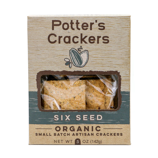 Regular price $7.49Regular priceUnit price perSale price $7.49Potter's Crackers are organic crackers designed with the best cheese and charcuterie in mind. Our Six Seed organic cracker combines organic sesame seed, poppy seed, pumpkin seed, and sunflower seed with brown and golden flax grown right here in Wisconsin. The reason this crispy cracker is so popular is because it pairs nicely with almost everything. It is a versatile, healthy snack that can be paired with both sweet and savory spreads and works really well with nutty cheeses like Emmentaler or Gruyere. We use real organic Wisconsin butter and milk to create a cracker that pairs with a wide variety of cheeses and charcuterie options. From natures bounty to your plate use this cracker to elevate your charcuterie experience!