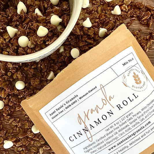 Regular price $12.00Regular priceUnit price perSale price $12.00Our Cinnamon Roll Granola is a healthy twist on the baked good we all know and love! With cinnamon, maple syrup, molasses, and white chocolate chips mixed in as the icing on top, this treat is sure to impress! Ingredients: Rolled Oats, Pecans, Coconut Flakes, Pure Cane Sugar, Molasses, Coconut Oil, White Chocolate Chips, Cinnamon, Vanilla, Salt and a whole lot of LOVE! All products produced in our kitchen are 100% gluten free and we take pride in sourcing the finest ingredients for our granola blends. -
