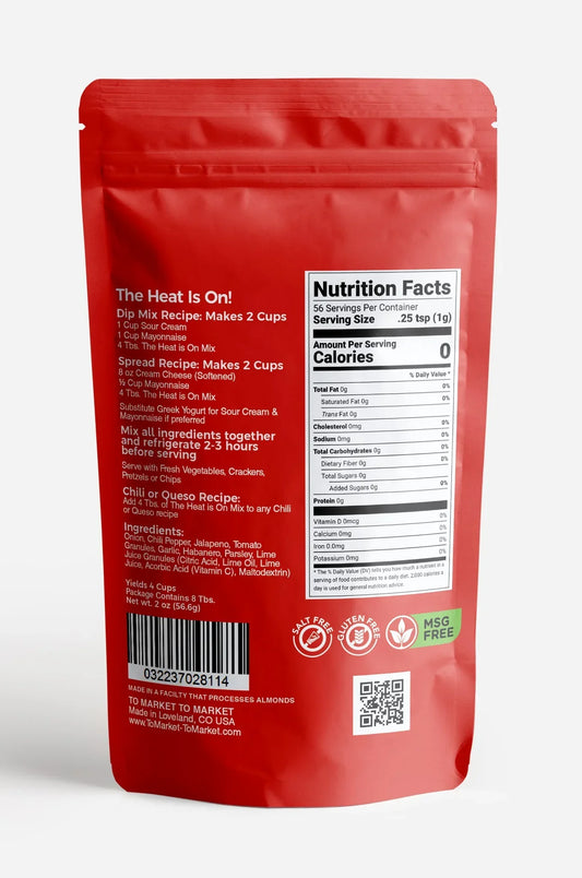 Regular price $6.95Regular priceUnit price perSale price $6.95Looking for a great way to spice up your food? The Heat is On packs a punch with great heat from Habanero and Jalapeno! Perfect for chili, queso or dip mix recipes!