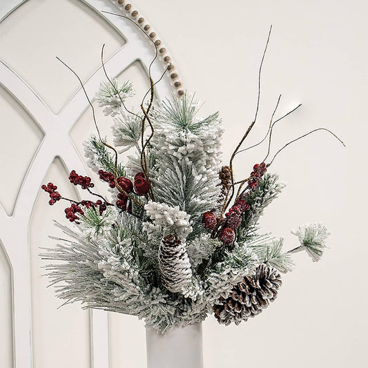 Regular price $24.50Regular priceUnit price perSale price $24.50The Frosty Pines Bush is a decorative floral pick with a flexible, brown-wrapped stem. The pick is filled with pine greenery, red berry clusters, and rustic pinecones, all finished with a coat of thick white flocking for a fresh snowfall effect. Display this pick inside of a vase or pitcher to dress up the home with a festive woodland look during the Winter and Christmas season. Measures 23” long. -