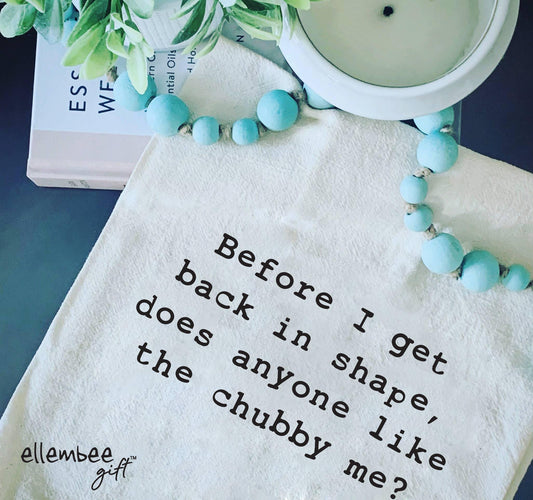 Regular price $13.95Regular priceUnit price perSale price $13.95Our natural kitchen towels are sewn and printed by hand (by our all female team!) in Michigan from 100% unbleached cotton. They measure approximately 24" x 26" when opened up, and can be thrown in the washer and dryer. They're printed with an eco-friendly, water-based ink, that's good for the environment and soft to the touch! Our natural towels are more textured than our white towels and come in a folded stack, (not on hangers) great for throwing over a ladder rung! They make a great hostess gift with a bottle of wine, or a fun stocking stuffer or white elephant gift too! KEYWORDS: before I get back in shape, does anyone like the chubby me? funny tea towels with words, best selling kitchen store products, screen printed towel, dish towels, funny sayings, tea towels, kitchen towels, made in Michigan, made in USA, flour sack towels, snarky gifts, best birthday gifts, gifts for coworkers, best selling kitchen towels, trending products, ellembee, funny products, elembee, lnb -