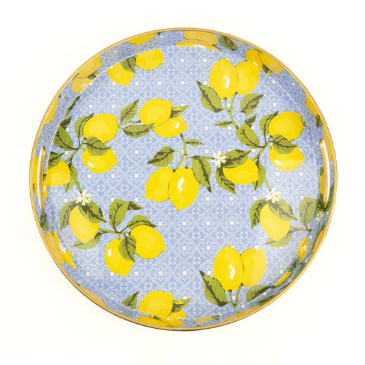 Featuring a vibrant blue tile print overlaid with cheerful lemons, this tray brings a fresh and playful touch to your tabletop or décor. The geometric tile pattern paired with the bright citrus accents creates a lively, Mediterranean-inspired aesthetic, making it perfect for serving, entertaining, or as a decorative accent that adds a pop of color to any space.