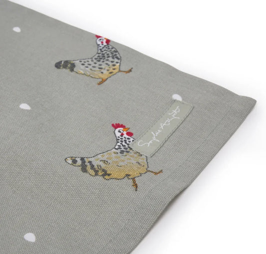 Regular price $22.00Regular priceUnit price perSale price $22.00This gorgeous Chicken tea towel is part of the Chicken collection of kitchen textiles, fine bone china, oilcloth and stationery. Perfect in any country kitchen and will make your drying up a bit more enjoyable. Quirky Speckled Maran Hens cluck around a sage grey cotton tea towel with some white eggs dotted around. A lovely little gift and great for anyone who collects our Chicken range or keeps their own Chickens. There is a handy sage grey 'loop' on the top left corner of the tea towel so you can hang it up in your kitchen.