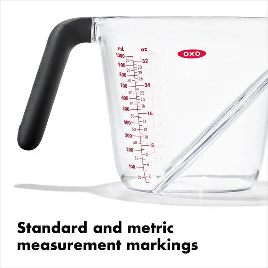 Regular price $15.99Regular priceUnit price perSale price $15.99Say goodbye to bending to check your liquid measurements. The OXO Good Grips 4-Cup Angled Measuring Cup makes everything from crafting cocktails to whipping up vinaigrettes easier, thanks to our revolutionary design that allows you to read the measurement by simply looking down into the Cup. Our Cup is a favorite with Good Housekeeping magazine editors because the patented angled surface inside lets you easily read cup, ounce and milliliter markings from above. Our lightweight, BPA-free Cup is made of Tritan™ Renew plastic. It has a non-slip handle and a generous spout that let you pour with comfort and control. Also available in Mini, 1-Cup and 2-Cup versions. Top-rack dishwasher safe.