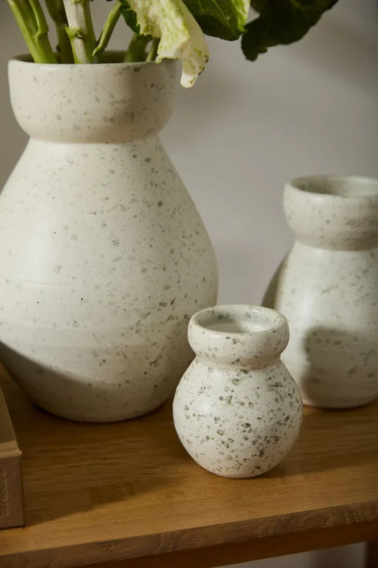 Regular price $16.95Regular priceUnit price perSale price $16.95A curvy shape & speckled finish give the Igneous Vase a handcrafted quality that warms up centerpieces or shelves as a home decor accent piece. This thick-walled ceramic vase features a rounded base & bowl-shaped opening above a tapered neck. Mostly smooth with a bit of texture, the surface is finished in a matte warm white glaze with a grey toned speckle resembling stone. Arrange all 3 Igneous sizes together for a decorative display or vessel filled with dried or fresh florals.