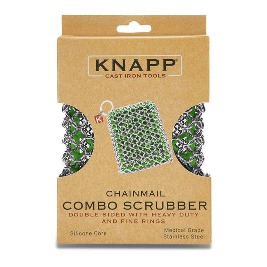 Regular price $29.99Regular priceUnit price perSale price $29.99The Knapp Made®️ Chainmail Combo Scrubber with Silicone Core features heavy duty stainless steel chainmail rings on the front and fine stainless steel chainmail rings on the back. This Knapp Made cast iron abrasive scrub makes it easy to clean cast iron, carbon steel, and stainless steel. Both the stainless steel chainmail rings and the silicone core are easy to clean and dishwasher safe. The silicone core provides a comfortable yet firm grip while the scrubbing pad requires minimal effort to clean cast iron, plus other cookware. The Knapp Made®️ Silicone Core Chainmail Combo Scrubber comes with a lifetime guarantee. -