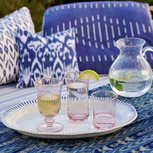 Regular price $28.00Regular priceUnit price perSale price $28.00Inspired by the traditional bubbly glassware from Provence and of sturdy construction to make everyday drinking, effervescent. From morning smoothies to sunset cocktails (or mocktails) this mouth-blown tumbler brings a charming spirit of joie de vivre to every sip. Offered in four chic and versatile hues: Basil, Chambray, Blush, and Clear (we always love to add a pop of color to the table with colorful glass)!