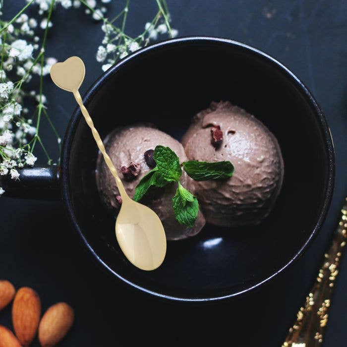 Fino's Gold-Plated heart-design Demi Spoon is perfect for stirring up all types of drinks, both hot and cold. Perfectly sized for use with a small 2-3-ounce coffee cup, known as demitasse, it's ideal for a perfect service of Italian and Cuban espresso, Turkish coffee, cappuccino, macchiato, mocha, cafe latte, ristretto, piccolo latte, Americano, flat white, long black, affogato, and more. It works equally well for spooning individual condiment portions served alongside each individual's dish, like butter, mayonnaise, sour cream, creme fresh, relish, honey, and other toppings. This little stainless steel spoon is up for the task at every dining occasion, from breakfast to lunch or brunch, holiday meals, party buffets, and entertaining guests outdoors. Made in Japan from gold-plated stainless steel and dishwasher safe for easy cleanup.