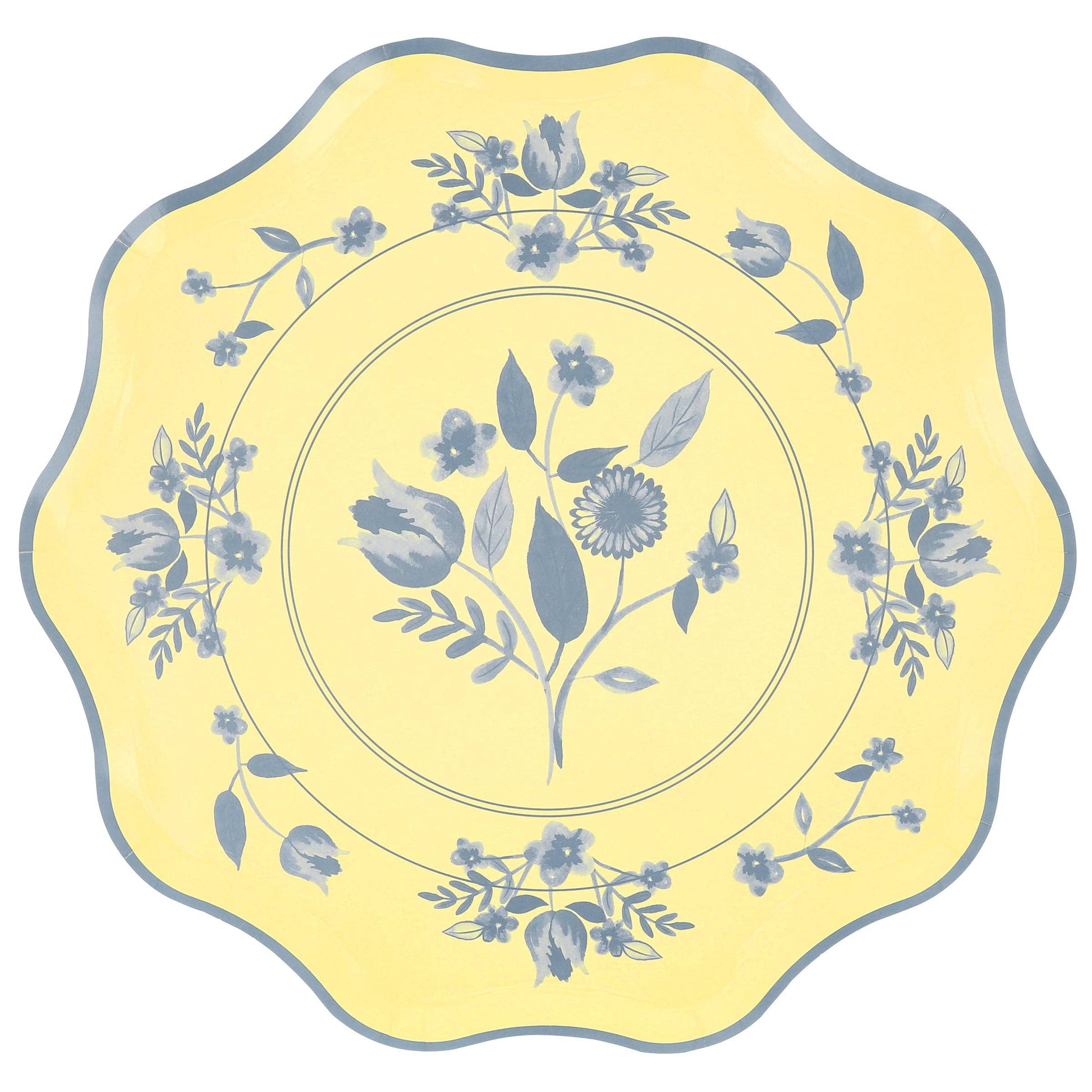 Create a sophisticated table setting with this set of pastel paper dinner plates. Soft shades of pink, blue, green and yellow, provide a fresh backdrop for delicate cobalt blue botanical illustrations. Inspired by vintage dinnerware, the design brings timeless style, while a waved edge adds refined detail. Coordinating pastel backs complete the look from every angle. Ideal for spring soirées, bridal showers, chic picnics, baby showers or any grown-up gathering.